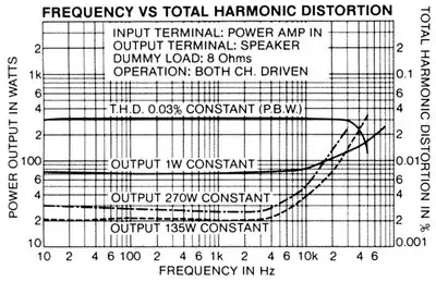 With both channels driving 8-ohm loads at 1,000 Hz, the outputs clipped at 300 watts per channel (IHF clipping headroom equals 0.46 dB). The dynamic headroom was 0.63 dB. ... The distortion at 1,000 Hz was nearly unmeasurable at any power level. It was no more than 0.003% from 0.1 to 100 watts output, rose to 0.0045% between 200 and 290 watts, and reached its maximum of 0.008% at 300 watts, just before clipping occurred. The intermodulation distortion (IM) was about 0.03% at most power levels up to 100 watts and reached 0.045% at 300 watts.