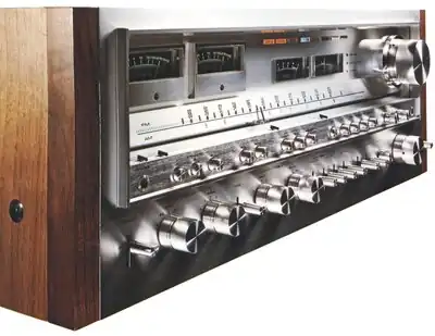 The SX-1980 is 22 inches (560 mm) wide, 19.5 inches (500 mm) deep, and 8.25 inches (210 mm) high, and weighs 78 pounds (35 kg).[1] The case, like the Pioneer HPM-100, has a fine-grain, walnut veneer finish. It has a pair of large die-cast aluminium heatsinks, located at the sides towards the back, in order to dissipate the immense heat that the receiver can generate. The receiver had 12 Field Effect Transistors (FETs), 11 Integrated Circuits (ICs), 130 transistors and 84 diodes. Its retail price in 1978 was US$1295. According to the CPI inflation calculator, that would equate to about US$5,450 in 2021.[6] The SX-1980 is known for its total harmonic distortion (THD) rating of less than 0.03% at rated power, which is much less than the 1–10% commonly used today. The build quality is also higher than average. The unit compares favorably in side-by-side tests with newer large receivers.[7] With a rated power consumption of 1400 volt-amperes or nearly 1000 watts, it would consume a fair amount of the power a standard 15-amp, 120-volt (North America) circuit can safely deliver.