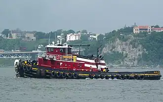 At Holy Loch, Scotland, harbor tugs Piqua, at left, and Natick (YTB-760) assist USS Hunley (AS-31)