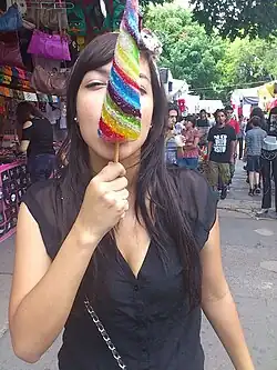 ![]() A Mexican woman during a festival, holding a big pirulí candy | |