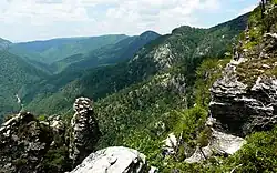 The Pisgah National Forest covers 512,758 acres (801 sq mi; 2,075 km2)[9] of mountainous terrain in the southern Appalachian Mountains, including parts of the Blue Ridge Mountains and Great Balsam Mountains. It is also part of the Appalachian temperate rainforest.Elevations reach over 6,000 feet (1,800 m) and include some of the highest mountains in the eastern United States. Summit elevations include Black Balsam Knob at 6,214 feet (1,894 m), Mount Hardy at 6,110 feet (1,860 m), Tennant Mountain at 6,056 feet (1,846 m), and Cold Mountain at 6,030 feet (1,840 m).[10][11] Mount Mitchell, in Mount Mitchell State Park, is the highest mountain east of the Mississippi River and lies just outside the boundary of Pisgah National Forest.