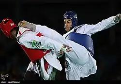During the taekwondo tournament, Taufatofua was eliminated in his first bout by the Iranian Sajjad Mardani once the score escalated to 16–1.[24] Taufatofua made an appearance at the closing ceremony of the games, showing up after a musical number in the same costume he wore during the Parade of Nations.[25]