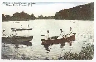 This area became known as the Pitman Grove, and while worshipers' tents originally lined each of the twelve roads, cottages slowly replaced the tents and formed the foundation of the town of Pitman. By the 1880s, the number of cottages had climbed to 400 and residents had begun staying year-round, both of which led to the establishment of the first public school in 1884. By 1887, businesses had cropped up north of the Grove in an area then-named Arbutus Hill, and in 1892, Alcyon Park was established.[25] The Grove directors resisted the secularization of the Methodist retreat,[25] but in 1904, Grove residents voted 122 to 35 for incorporation as an autonomous borough. On May 24, 1905, Governor of New Jersey Edward C. Stokes signed a law granting the incorporation.[26][27][28]