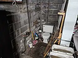 A Pittsburgh toilet, or Pittsburgh potty, is a basement toilet configuration commonly found in the area of Pittsburgh in the United States. It consists of an ordinary flush toilet with no surrounding walls. Most of these toilets are paired with a crude basement shower apparatus and large sink, which often doubles as a laundry room.