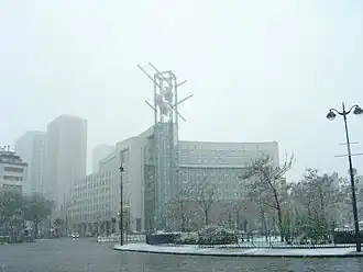 A fictionalized Place d'Italie was the setting of several lessons in Voix et Images de France, an audio-visual French language instruction method used widely in schools in the 1960s and 1970s. Developed by the Centre de Recherche et d'Etude pour la Diffusion du Français (CREDIF) at the Ecole Normale Superieure de Saint-Cloud in France,[4] this method matched lines of prerecorded French dialogue to corresponding projected images of French people and locales to enable students to learn the language by placing it in various visual and conversational contexts.[5] The program's fictional characters included Monsieur Thibaut, Madame Thibaut and their children, Catherine and Paul, who all lived at No. 10 Place d'Italie.[6] This is a real apartment building with street-level stores in the square[7] (pictured in the insert above), built around the turn of the 20th century in a combination of French Mansard and English Jacobethan architectural styles.