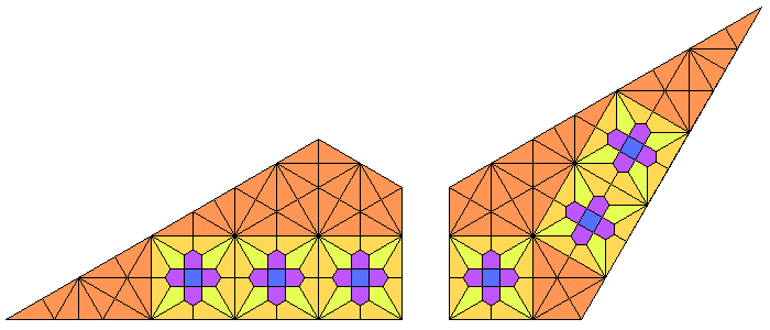 If - tiling means dual uniform, Catalaves tiling, then there exists a 11-9 tiling,[7] a 13-10 tiling, 15-11 tiling, a 19-12 tiling, two 22-13 tilings, and a 24-14 tiling. Also exists a 13-8 slab tiling and a 14-10 non-clock tiling. Finally, there are 7-5 tilings using all clock planigons:[10]