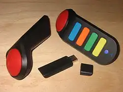 The Buzz! Buzzer is a special controller designed specifically for the Buzz! quiz game series. The controller features a large red buzzer button and four smaller coloured buttons for answer selection. Both wired and wireless versions are available and come bundled with Buzz! games. A four-buzzer set acts as a single USB device and connects a USB port on the PlayStation 3. Wireless versions connect via a USB dongle, with each dongle able to support up to 4 wireless buzzers at a time. A second dongle is required for additional buzzers (for 8 player games). Both the wired and wireless versions of the buzzers are compatible with both PlayStation 2 and PlayStation 3.