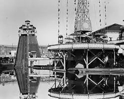In 1926, George Whitney became general manager of the growing complex of seaside attractions and changed the name to Playland-at-the-Beach, also sometimes known as Whitney's at the Beach.[9][10] Although the attractions continued to be operated as independent concessionaires, during the late 1920s and 1930s, especially during the Depression when concessions began to fail, George and Leo began to purchase the attractions outright.[10] The Whitneys bought the roller coaster in 1936 and the merry-go-round in 1942.[9] Playland took up three city blocks and, in 1934, the Midway had 14 rides, 25 concessions, and four restaurants besides Topsy's Roost.[9]
