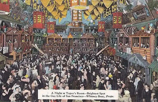In 1929, George Whitney relocated Topsy's Roost, a popular restaurant specializing in chicken, which had been established two years previously at the south end of the esplanade. He moved the business into the former Ocean Beach Pavilion just north of Playland at the foot of Sutro Heights.[19][10] The ballroom had been constructed in 1884–85.[19][20] Driving south along the beach on the Great Highway from the Cliff House, the first building you came to was Topsy’s Roost, which became more than just a chicken dinner house—it was also a popular nightclub. It had a live orchestra and dance floor and was decorated so it looked like the patrons were sitting in ramshackle chicken coops. There was seating on the main floor around the dance floor as well as the balcony. Patrons sitting on the balcony level could slide from their coops down to the dance floor if they wanted to dance. The restaurant was named for Topsy, a character in Harriet Beecher Stowe's Uncle Tom's Cabin and its decor depicted Negro stereotypes.[19] All workers were African American, except for management.[10]