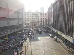 Prior to World War II, Plaza Lacson was considered the heart of Manila,[1] and constituted part of the city's downtown area, which also included Plaza Santa Cruz, Rizal Avenue and Escolta Street. Commercial activity shifted to here from Binondo in large part due to infrastructure improvements made during the American colonial period to improve access to the northern half of the city, which were centered on the plaza. These included the completion of the Santa Cruz Bridge in 1902,[2] and the opening of the Manila tram system a few years later, which had its central terminal at the plaza.[3] The area around the plaza was largely commercial, with bars and restaurants that catered largely to American servicemen either visiting or stationed in the Philippines,[4] complementing the luxury stores along Escolta and the theaters around Plaza Santa Cruz.[3]