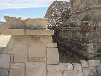 The north and south basements were modified three times, when originally built they had certain symmetry, with an overhang decoration over the wall sides, it became more complex on the second stage of the north basement, while on the south basement it was simpler; in both cases, a stone slab holds most of the ornament weight.[3]