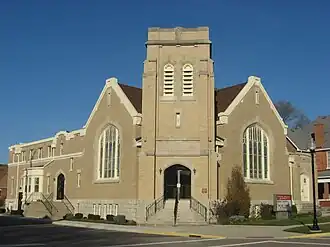 The church is a Gothic Revival structure built with an Akron Plan interior.[1] The structure relies on limestone for its foundation and walls, with a roof of ceramic tile and occasional elements of wood. Located on a corner lot, the building features a tower on the corner facing the intersection; worshippers can enter by climbing a small flight of stairs to the base of the tower. Large gabled sections with fat ogee-arched windows face both streets, with a functional addition to the rear.[4]