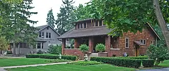 The Pleasant Ridge Historic District is almost entirely residential, and is made up of residences primarily constructed between 1910 and 1930. These houses include various architectural styles, but are substantially historical revivals such as Colonial, English Tudor, Dutch Colonial, English Cottage, French Eclectic and Spanish Colonial. There are also examples of the Arts and Crafts style, including Craftsman and Prairie School types. The original section of the district contains 181 structures, of which 151 contribute to the historical character of the neighborhood.[2] The 2010 addition contains an additional 340 structures, of which 326 contribute to the historical character of the neighborhood.[3]