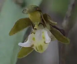 Plectorrhiza tridentata, commonly known as the common tangle orchid,[2] is an epiphytic or lithophytic orchid that has many coarse, tangled roots, up to twenty narrowly elliptic to egg-shaped or oblong leaves and up to fifteen green or brown, star-shaped flowers with a white labellum. It grows on rainforest trees and in other humid places and occurs between the Daintree National Park in Queensland and the far north-eastern corner of Victoria.