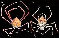 Pleistacantha has a pyriform carapace which is longer than it is wide – at most 146 mm (5.7 in) long.[4] The carapace is densely covered by spines and granules, and its walking legs are lined with spines and spinules.[4] Its first pair of gonopods is slender and, like in all oregoniid crabs, features a longitudinal groove.[5] Males have a tapered abdomen, and depending on the species, the sixth abdominal segment and the telson may be either separate or fused together.[4]