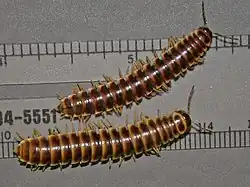 | Male (top) and female (bottom) wandering cherry millipedes, Pleuroloma flavipes | |