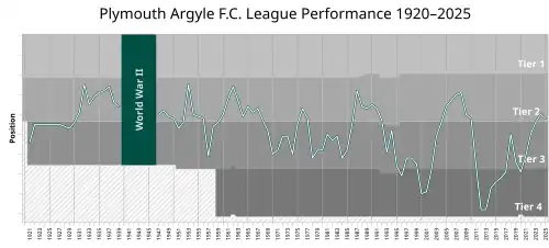 Argyle were relegated from the Second Division in 1968, 1977 and 1992, having won promotion out of the Third Division as runners-up in 1974–75 and 1985–86. The club was relegated to the fourth tier for the first time in 1995, and though it would win immediate promotion in 1995–96, was relegated again in 1998. Promoted as champions under Paul Sturrock with 102 points in 2001–02, Argyle secured a record fourth third-tier league title in 2003–04, and would remain in the Championship for six seasons until administration and two successive relegations left the club in League Two by 2011. In 2016–17, Argyle won promotion to League One, and again in 2019–20 following relegation the previous season. In the 2022–23 season, Argyle returned to the Championship as champions, winning the third-tier league title for a record fifth time.[2]