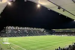 Later that month, temporary seating was once again put in place on the Grandstand, this time as a one-off for an FA Cup 3rd round replay vs Liverpool.[88] The seating was kept in place for the next home match, a League 2 game vs Devon rivals Exeter City, but tickets were not on sale to the general public. Shortly after this game, the seating was removed.[89] In 2021 the redevelopment of the Mayflower stand was completed, expanding the ground's capacity to 17,900 and making it an all seater stadium.[90]