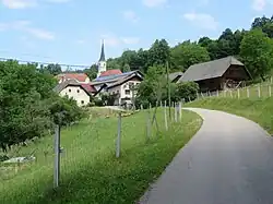 The local church is dedicated to Saint Paul and belongs to the Parish of Gabrovka. It was built in the late 14th century as the chapel of the now ruined Gallenstein Castle. The castle was destroyed during Ottoman raids in the 16th century. The interior of the church was painted three times: around 1420, in the late 15th century, and again in 1539.[4]