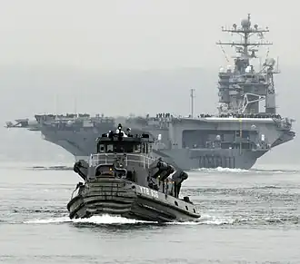 Pokagon (YTB-836) returns to the pier as the Nimitz-class aircraft carrier USS Abraham Lincoln (CVN-72) departs Naval Station Everett, WA. for a scheduled deployment to the 5th Fleet area of responsibility.
