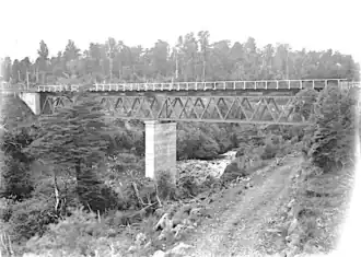 Over a kilometre north of Pokaka,[26] Manganui o te Ao Viaduct is a straight viaduct, 290 ft (88 m) long and up to 112 ft (34 m) above Manganui o te Ao River, supported by a single concrete pier.[27] Each 1908 girder was 122 ft (37 m) long, with 230 tons of steel in the bridge,[28] costing £8,840.[29] The original viaduct was replaced in 1967,[24] or 1964, by a slightly longer 91 m (299 ft) reinforced and pre-stressed concrete viaduct.[11]