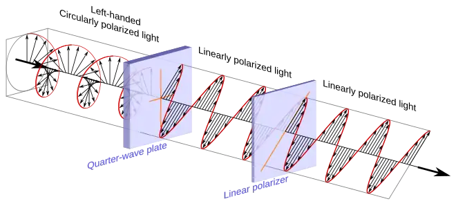 First note that a quarter-wave plate always transforms circularly polarized light into linearly polarized light. It is only the resulting angle of polarization of the linearly polarized light that is determined by the orientation of the fast and slow axes of the quarter-wave plate and the handedness of the circularly polarized light. In the illustration, the left-handed circularly polarized light entering the polarizer is transformed into linearly polarized light which has its direction of polarization along the transmission axis of the linear polarizer and it therefore passes. In contrast right-handed circularly polarized light would have been transformed into linearly polarized light that had its direction of polarization along the absorbing axis of the linear polarizer, which is at right angles to the transmission axis, and it would have therefore been blocked.