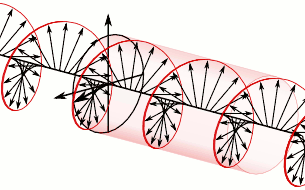 At the top of the illustration toward the right is the circularly polarized light after it leaves the wave plate. Directly below it, for comparison purposes, is the linearly polarized light that entered the quarter-wave plate. In the upper image, because this is a plane wave, each vector leading from the axis to the helix represents the magnitude and direction of the electric field for an entire plane that is perpendicular to the direction of travel. All the electric field vectors have the same magnitude indicating that the strength of the electric field does not change. The direction of the electric field however steadily rotates.