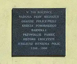 The settlement was first mentioned in 1243. Pomeranian duke Barnim of Pomerania granted Magdeburg law to the town in 1260.[3][4] At the end of the 13th century, the town had become a fief of a local dynasty of knights, the Drake family.[5] In 1321, with the death of Otto Drake, the town became a dependency of nearby Stettin (now Szczecin),[5] hindering its growth until the mid-18th century.