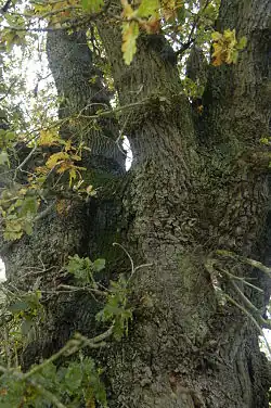 Oaks, when very old, can form new trunks from the growth of pollard branches; that is, surviving branches which have split away from the main branch naturally.