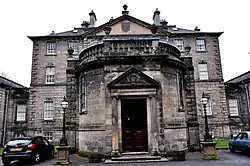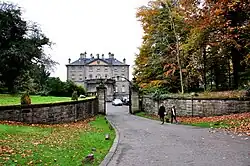 There is also a complex of offices, stables and a sawmill, part of which dates from the 18th century.[8][9] The stone arch bridge leading to the house over the White Cart Water was constructed in 1757.[10] The heraldic lions on the gate piers were carved by John Marshall to a design by Huw Lorimer in 1950.[11]