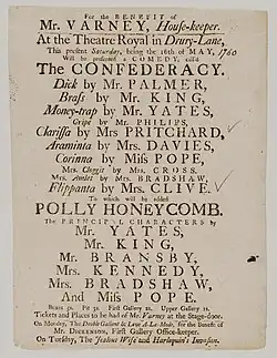 1760 playbill for Polly Honeycombe at Theatre Royal, Drury Lane