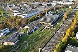 In 1898, the Szczecin Pomorzany (German: Stettin Pommerensdorf) railway station was opened near the current Grudziądzka Street, and operated on the line between Szczecin Main Station and Police. It operated until 1953 when it was closed down, and later reopened in 1984, at a new location near Powstańców Wielkopolskich Avenue, where it operated until 2002.[2][7][8] In 1899, Pomorzany was also the final station on the narrow-gauge railway line leading to Casekow.[2][9][10] Within the neighbourhood were located stations of Pommerensdorf Kleinbahnhof (narrow-gauge station) and Pommerensdorf Hafen (harbour) near Bygdoska Street, and Güstow near the corner of Szczawiowa and Ustowska Streets, for the nearby village of Ustowo.[11][12][13] The line was closed down in 1946, with most of the rail tracks being removed.[2][9][10] Additionally, in 1936, between current Białowieska, Milczańska, and Orawska Streets, was opened the Szczecin Wzgórze Hetmańskie railway station, originally known as Kosakenberg, which operated passenger lines until 1998. It included a locomotive deepot which is used to the present day.[2][14]