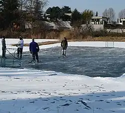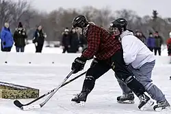 Pond hockey is just like indoor ice hockey but is played outdoors and most of the time on a lake or pond. Pond hockey tournaments are typically played four on four but when playing casually there is no set number of players on a team, though the players try to balance the sides as best they can. Depending on equipment and player's availabilities, pond hockey may or may not use a goalie. If a goalie is not used, the goals can be defined with anything from open, regular hockey nets to player's boots.[1] Since pond hockey started the popularity has soared, official pond hockey tournaments are found across the globe. Pond hockey tournaments have entwined the concept of youth pick-up hockey into a serious art form. The rink can range from any size or shape but they typically resemble a scaled-down regular indoor ice hockey rink. Some pond hockey rinks use boards, however, in most, the surrounding piled up snow from clearing the pond or lake makes a good substitute. In some of the more prominent pond hockey tournaments official ice hockey boards are used. One rink for example, the rink from the U.S. Pond Hockey Championship is set up into 155-foot (47 m) long ovals.[2]