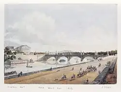 The architect Jean-Rodolphe Perronet was commissioned in 1787 with this new bridge. It had been planned since 1755, when construction of "place Louis XV" (now "place de la Concorde") began, to replace the ferry that crossed the river at that point. Construction continued in the midst of the turmoil of the French Revolution, using the dimension stones taken from the demolished Bastille (taken by force on 14 July 1789) for its masonry. It was completed in 1791.[1][2]