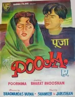 Pooja (Hindi for "Worship") is a 1954 Bollywood film starring Bharat Bhushan and Purnima, produced and distributed by Varma Films.[2] It was directed by Bhagwan Das Varma, one of the founders of Varma Films, who had earlier also directed the film Aurat (1953) for Varma Films.[3] Bharat Bhushan, who was playing the lead role in Pooja, had previously worked as the lead actor in two films distributed by Varma Films: the box-office hit Suhaag Raat (1948)[4] and Thes (1949). Pooja was the first film in which Purnima, who had previously worked in supporting roles for several movies for Varma Films, worked as the leading actress in the film.