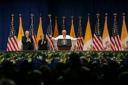 After the Mass, he went to the Catholic University of America to address representatives from American Catholic universities, diocesan schools, and others about the role of the Church in education. After that, he went to the university's Pope John Paul II Cultural Center to meet privately with about 200 representatives of Judaism, Islam, Jainism, Buddhism, and Hinduism to promote interfaith dialogue.[9]