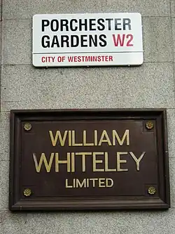 Porchester Gardens is a street in the Bayswater area of London.[1] Located in the City of Westminster, it runs east to west and crosses Queensway. Like several streets in the area it was developed by Edward Orme.[2] In 1879 the engineer R. E. B. Crompton lit his house by electricity, effectively the first in London to do so.[3] The department store Whiteleys was located where the two streets joined before its closure.[4] The road features a mixture of residential and commercial properties. At the eastern end, Porchester Terrace runs southwards to Kensington Gardens while in the west it ultimately merges into Kensington Gardens Square and Leinster Square. Moscow Road runs parallel to the south for much of the route.