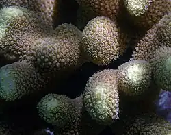 Porites cylindrica, commonly known as Hump coral, is a stony coral belonging to the subclass Hexacorallia in the class Anthozoa. Hexacorallia differ from other subclasses in that they have six or fewer axes of symmetry.[2] Members of this class possess colonial polyps which can be reef-building, secreting a calcium carbonate skeleton.[3] They are dominant in both inshore reefs and midshelf reefs.[4]