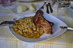 Porotos con rienda (English: beans with reins) is a typical Chilean dish made of boiled beans with spaghetti, chorizo, diced pumpkin, chili, and onions.
