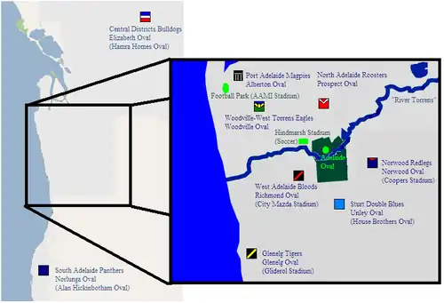 Talk of a side from South Australia entering the Victorian Football League (VFL) was fast-tracked in 1987 when a team from Western Australia, the West Coast Eagles, and a team from Brisbane, the Brisbane Bears, joined the VFL. This left South Australia as the only mainland state in Australia without a team in an increasingly national competition. By 1989, seven out of ten SANFL clubs were recording losses and the combined income of the SANFL and West Australian Football League (WAFL) had dropped to 40% of the VFL.[4] During early 1990 the SANFL decided to wait three years before making any further decision in regards to fielding a South Australian side in the VFL until it could be done without negatively affecting football within the state. Frustrated with lack of progress, Port Adelaide held secret negotiations in the town of Quorn regarding entering the VFL in 1991.[5] From these discussions, Port Adelaide accepted an invitation from the VFL (which had since been renamed the Australian Football League). The AFL signed a heads of agreement with the club in expectation that Port would enter the competition in 1991, meaning the Port Adelaide Football Club would field two teams, one in the AFL and one in the SANFL. During the 1990 preseason, Port Adelaide played a practice match against Geelong at Football Park in front of 35,000 spectators.[6] When the knowledge of Port Adelaide's negotiations to gain an AFL licence were made public, the rest of the SANFL and many other people across the state saw it as an act of treachery. SANFL clubs made an application to the Supreme Court of South Australia for an injunction against the bid, which Justice Olsson agreed to.[4] The AFL suggested to the SANFL that if they did not want Port Adelaide to join the AFL, they could put forward a counter bid to enter a composite South Australian side into the AFL. After legal action from all parties, the AFL finally agreed to accept the SANFL's bid and the Adelaide Football Club was born.[7]