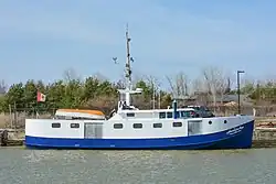 By the 1920s Port Burwell was becoming a summertime tourist destination famous for its sandy beaches, which had formed over the years as a natural result of wind and water currents interacting with the breakwaters extending out from the harbour mouth.[10] This shoreline accumulation was a well-known phenomenon which also necessitated periodic dredging to keep the harbour clear.[11] Port Burwell was also becoming a focus for natural gas drilling onshore as well as the collection point for pipelines from gas wells drilled offshore.[12] It also gained fame as the home of McConnell Nurseries, which relied upon the sandy loam in nearby farmland and the reduced frost risk near the lakefront. It developed a nation-wide mail order business for seeds and plants and for many years was the largest employer in the area.[13] The harbour's coal business changed when the Ashtabula was wrecked in a collision with a freighter in 1958, ending the railcar ferry's daily coal shipments. instead, the harbour became known for mountains of loose coal delivered by freighters for later pier-side loading into waiting railcars and transport trucks. All this was wound up after the federal government announced in 1970 it would no longer fund dredging of the harbour to support coal freighter traffic.