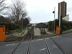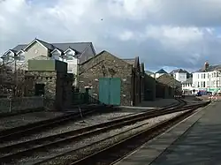 At the eastern end of the station is a level crossing (one of the last remaining manual ones on the railway, automated in 2011) across Droghadfayle Road. Until the yard trackwork was re-laid in 1999-2000 the locomotive crew had to open and close the gates whilst "running round" to couple onto the train for departure, but this can now be done without disturbing traffic as the pointwork has been modified to accommodate this.