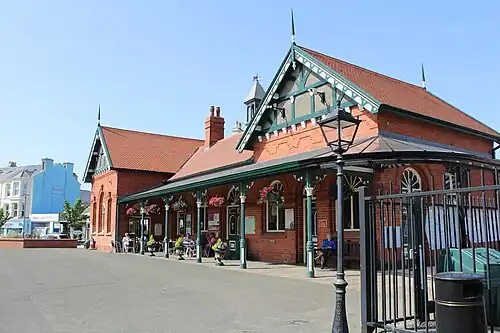 The main station building is constructed of Ruabon brick and was constructed in 1909 in the centre of the village, replacing a similar original version that was slightly smaller and made of local stone. This building is something of a focal point in the village and houses a booking office, a waiting room which was once a ladies only facility and a café in the former porters' office. This building was extended in the mid 20th century: the extension is now the mess room for locomotive crews, though it was built as a ticket office for Isle of Man Road Services, a subsidiary of the railway company. This extension, which also provides part of the station toilets, has in the past been home to the local Royal National Lifeboat Institution charity shop among others. It is proposed to remove the former bus office, install a new entrance to the station toilets from the street side of the building, and install a new canopy along the street side of the building. This will allow bus services to be moved from the present shelter on Bridson Road.