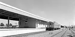 Facilities constructed at the station included a waiting room, a refreshment room, a resthouse for train crew, a locomotive stabling depot, diesel fuelling, passenger car water supply, and a turntable.[7] As had occurred at Port Pirie Junction station, a run-around loop on each side permitted locomotives to be detached and turned, and a shunting locomotive took the carriages away to be placed in the sequence needed for the return journey.[note 2] The Indian Pacific, which first arrived in Port Pirie on 24 February 1970,[8] was the exception: since Port Pirie was only a pause in its journey, its carriages did not need to be rearranged. However, the entire train needed to be pushed back for 3.6 kilometres (2.2 miles)[9] to return to the mainline and continue on its way – a time-wasting procedure. Much longer operating delays occurred with freight traffic, not only because of the dead-end configuration of the tracks but also because broad-gauge and standard-gauge bogies had to be exchanged on all freight cars that travelled between the South Australian Railways and Commonwealth Railways. A 1971 report stated: "It is expected that in the near future the Australian National Railways Commission will construct a by-pass line around the Port Pirie yard and station to facilitate the fast through movement of freight trains between Sydney and Perth."[3]