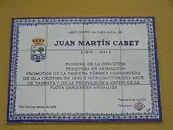It was a salting businessman from Isla Cristina, Martín Cabet, the promoter of a new gear that he adapted to the galleon brought to Spain by himself from Boston, the tarrafa (purse seine gear dedicated to catching sardines).[5] Martin Cabet adapted it perfectly to the ship, propelled by oars (and later adapted it for steam propulsion) and with its larger dimensions, better maneuverability and allowing sets in deeper waters, it will overcome the restrictions imposed by Portugal in its jurisdictional waters without violating the 1883 treaty, fishing in its own waters without navigating them. In other parts of the province, it was preferred to trade with Portuguese sardines instead of fishing them, which reduced the dynamism and prevented the modernization of those ports, in addition to the risks involved, since Portugal also had an important canning industry.[5]