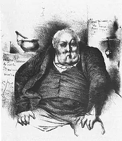 Before the official exhibition, Ingres displayed the painting in his studio for friends and pupils. Most were lavish in their praise, although Louis Lacuria confided to a friend that he feared people might "find the colouring a bit dreary".[38] He proved correct; at the Salon, critics praised the draftsmanship, but some felt the portrait exemplified Ingres' weakness as a colourist.[39] It was routinely faulted for its "purplish tone"—which the ageing of the oil medium has transformed over time to warm greys and browns.[40] Bertin's wife Louis-Marie reportedly did not like the painting; his daughter, Louise, thought it transformed her father from a "great lord" to a "fat farmer".[41] Given the standings of the two men, the painting was received in both social and political terms. A number of writers mentioned Bertin's eventful career, in tones that were, according to art historian Andrew Carrington Shelton, either "bitingly sarcastic [or] fawningly reverential".[38] There were many satirical reproductions and pointed editorials in the following years. Aware of Bertin's support of the July Monarchy, writers at the La Gazette de France viewed the portrait as the epitome of the "opportunism and cynicism" of the new regime. Their anonymous critic excitedly wondered "what bitter irony it expresses, what hardened skepticism, sarcasm and ... pronounced cynicism".[42]