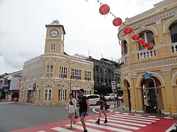 Several buildings in the Old Town area of Phuket were constructed in a Sino-Portuguese architectural style.[34] Majority of these were constructed in the early 1900s following the arrival of Chinese immigrants employed by the Portuguese,[35] and a fire in 1903 which meant many buildings were rebuilt in a Sino-Portuguese style.[36]
