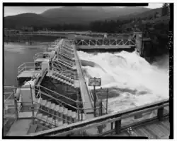 The site of the Post Falls Dam was previously home to a 20-foot wooden diversion dam built by pioneer settler and namesake of Post Falls, Frederick Post, who purchased the land from Chief Andrew Seltice of the Coeur d'Alene Tribe for $500 in 1871.[5] Post built his original dam to power a sawmill on the north channel of the river.[2] The sawmill burned down in 1902 and the site was sold to Washington Water Power, now known as Avista, which began construction on the three dams for hydroelectric power generation. The powerhouse, located on the central channel, was completed in 1906.[1]