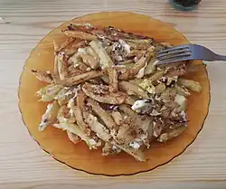 The potatoes are sold directly by the farmers at wholesale markets or else to middlemen who sell them to other markets or to shops.[3]: 12 The Algerian Ministry of Agriculture provides a subsidy (Le Système de régulation des produits agricoles de large consommation, SYRPALAC) to growers to store their potatoes, under government control, with the aim of providing a supply in times of shortage.[3]: 10 Storage space is currently limited but more facilities are under construction.[3]: 20 Potatoes are commonly eaten as chips (French fries) which are widely available as street food. The vast majority of these are cut and prepared by hand as there are no Algerian factories producing chips. Some factories do operate to manufacture crisps (potato chips) but less than 1% of Algerian potato production is processed in a factory.[3]: 12