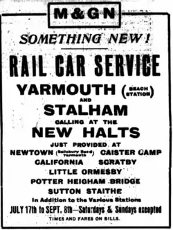In 1933 the Midland and Great Northern Joint Railway introduced a small railcar “Tantivy” to enhance the summer service on the line between Yarmouth and Stalham. This allowed the introduction of seven new halts, which saved people walking a mile or more to the nearest station. The new halts were for Newtown, Caister Holiday Camp, California, Scratby, Little Ormesby, Potter Heigham Bridge and Sutton Staithe. Each of these was a request stop[1]